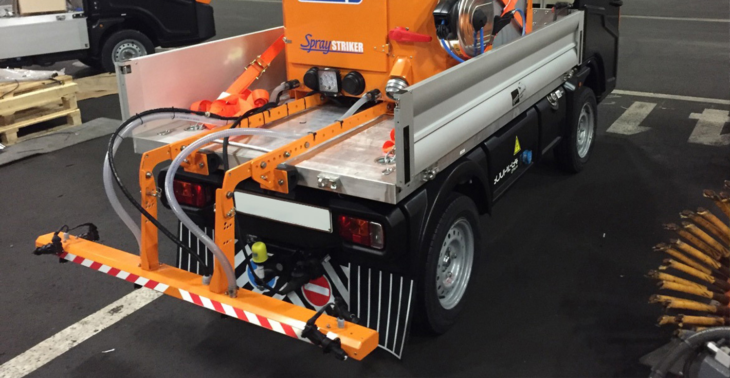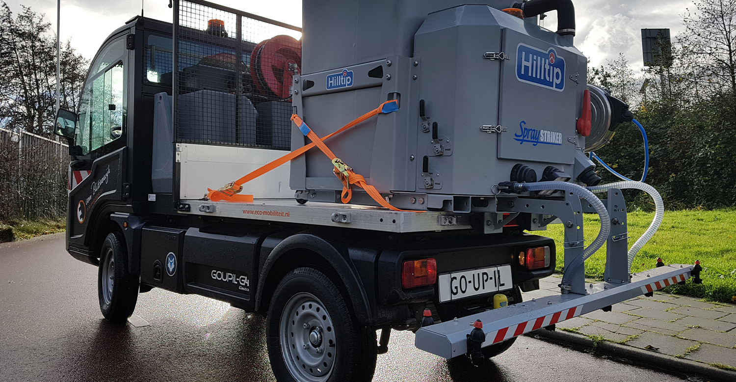 Samen met de Goupil G4 vormt onze pekelsproeier de perfecte combinatie voor duurzame, CO2-neutrale gladheidsbestrijding. Zowel het voertuig als de sproeier (in dit geval een Spraystriker 500 voor pick-up en werktuigdrager) zijn namelijk 100% elektrisch aangedreven.