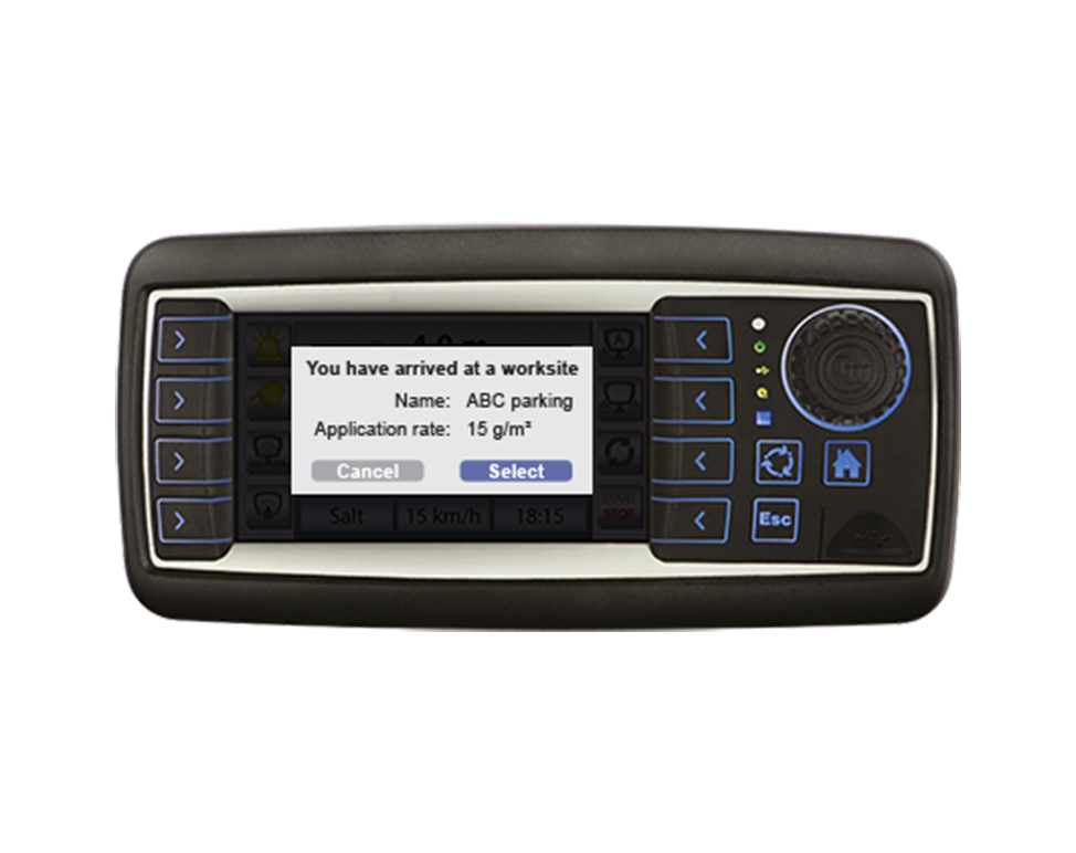 Zodra een voertuig bij een vooraf ingestelde werklocatie arriveert, verschijnt er een melding op de controller met informatie over het betreffende terrein. Wel zo handig voor de chauffeur.